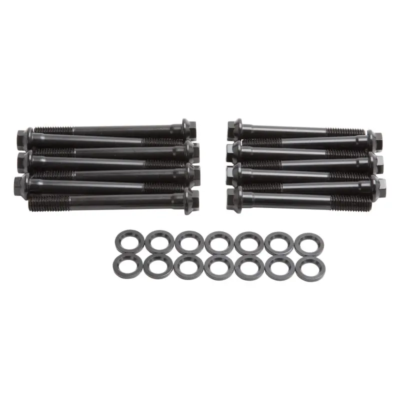 The Edelbrock #8533 bolt kit contain a complete set of the highest quality head bolts and hardened washers available. Cold-formed to ensure molecular integrity and heat treated prior to thread rolling and machining. Reduced diameter bolt heads eliminate the need for valve train removal to facilitate cylinder head re-torqueing. Hardened and parallel-ground washers are included. Rated at 170,000 p.s.i.